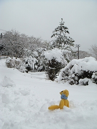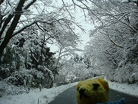 見事な雪景色の大室山山麓を眺めつつ、吹雪ならぬ