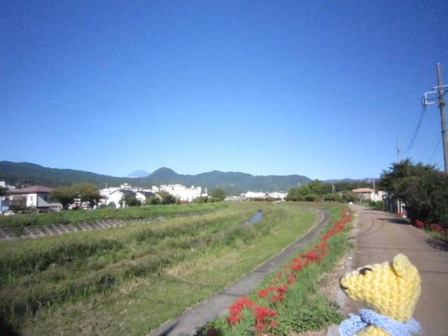 土手にはヒガンバナ、遠くに富士山、 空気もカラッと気持ちいい。