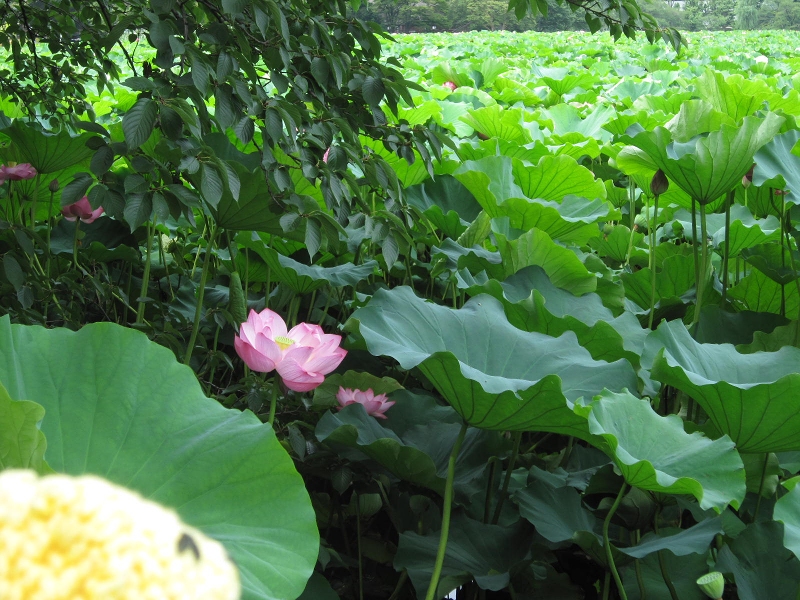 不忍池はちょうどハスの花が見頃。甘い香りが漂っている。梅雨に戻ってしまったかのようなまとわりつくような湿度も、こういう景色のなかなら馴染む。