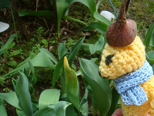 球根の殻を被ったままこんなに育ってしまったチューリップ発見。
