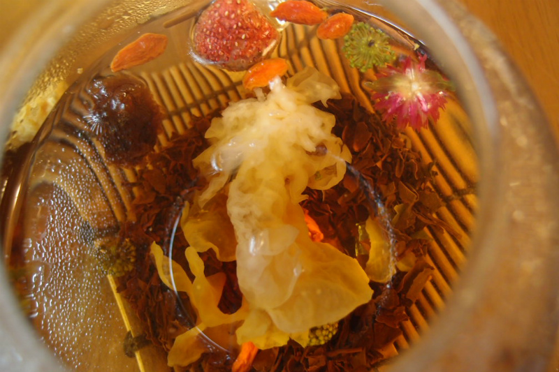 神奈川産の紅茶、クコの実、百合根、白キクラゲ、苺、千日紅、田七人参花、胖大海、氷砂糖。