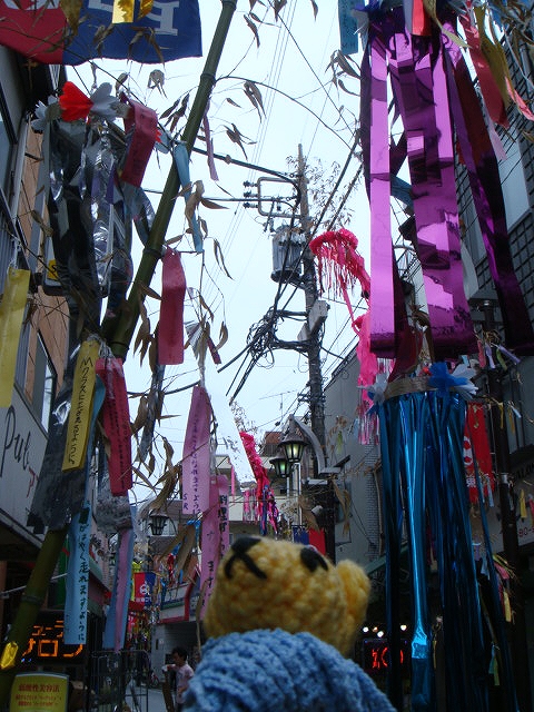 小学生の願い事の短冊がかかったササ飾りが商店街にずらっと。