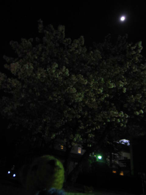 夜は花冷え。半月の下の満開夜桜が冴え冴えと。