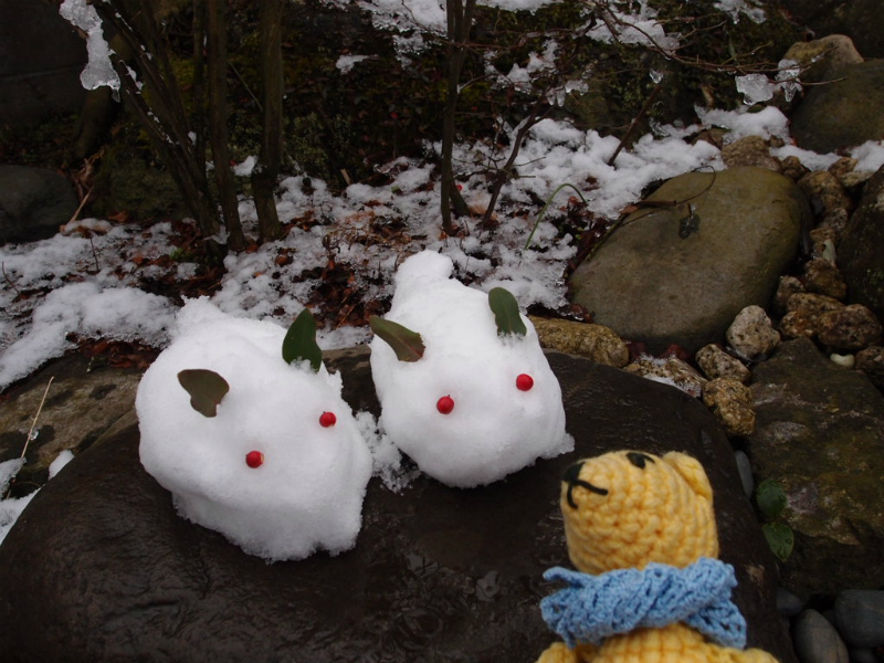 ゆうべ積もった雪が残る朝。庭に雪うさぎが来ました。
