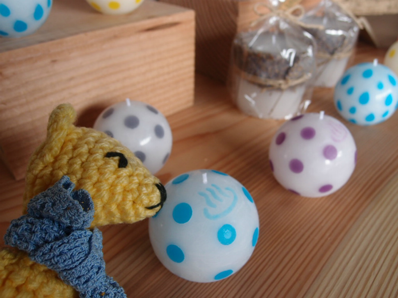 「RainWater-dots&stripe」でお目見えのmieさんの新作、温泉マークの入ったキャンドル!