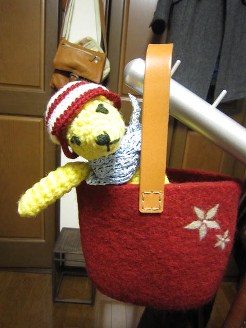 先月末の手づくりマーケットでびびっと出会ったフェルトバッグと手編みの帽子。