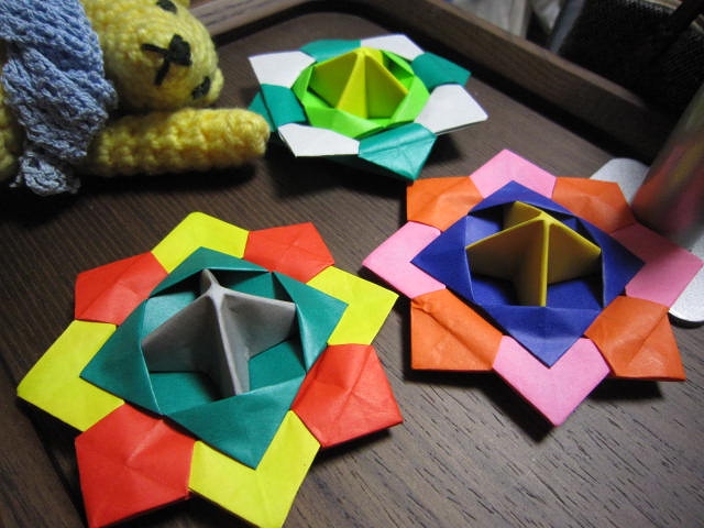 3枚の折り紙を使って組み合わせるだけでコマができる。