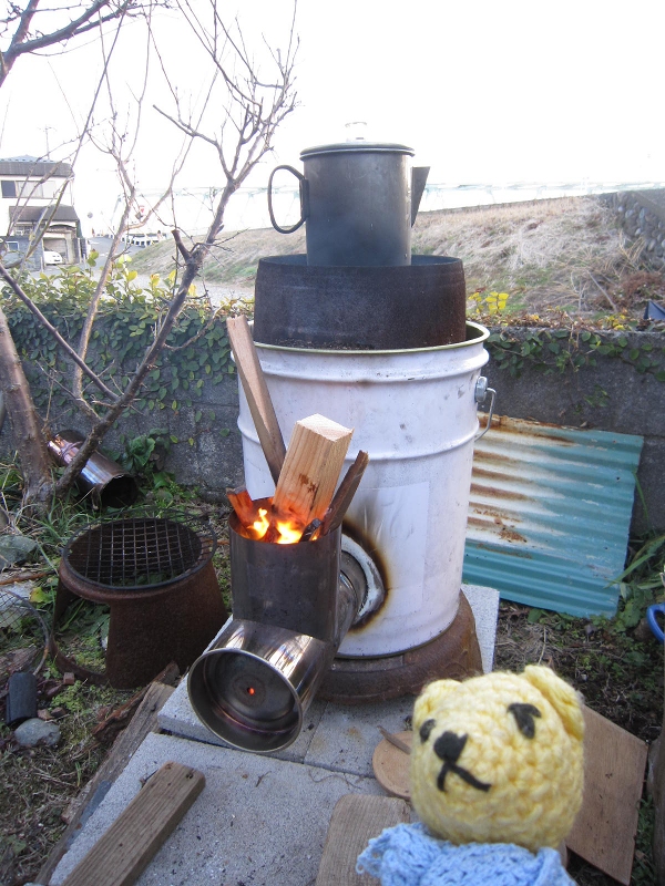 青空雑貨店の一角でペール缶のロケットストーブがゴーッと働いていた。