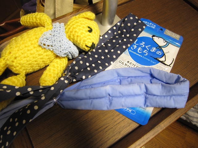 水に浸して首にまくサマースカーフ、しろくまのきもち。先月半ばから使ってるけどけっこういいみたい。最近じゃこれつけてないと外を歩くのがちょっと不安だったりして。