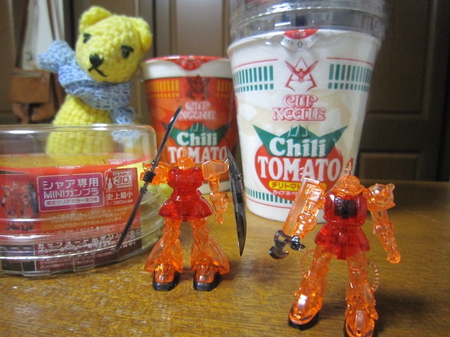 チリトマトヌードルのシャア専用が出た、とのことでゲルググをいただいた。コンビニ行ったらザクがいたのでそちらもGET。全3種類、あとはズゴック!