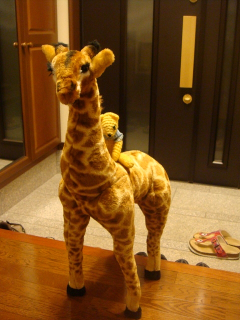 小さい頃からキリンが好きでねぇ。ロト6のCMじゃないけどキリンのいる生活っていいよなーなんて思って、大人が乗っても大丈夫なキリンさんを連れて帰ってきちゃった。うれしーい!
