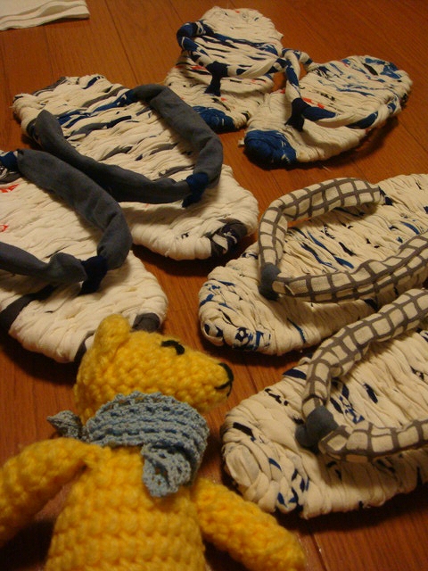 古い手拭で布ぞうりを作ってみた。手拭5枚で1足できて作り始めると面白い。