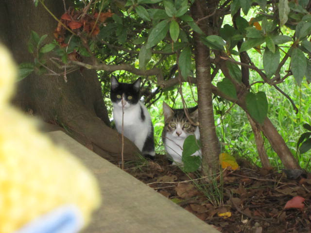 茂みのなかから子猫が2匹、じっと見つめていた。