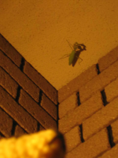 夜に活動中のカマキリ。玄関の天井にいた。