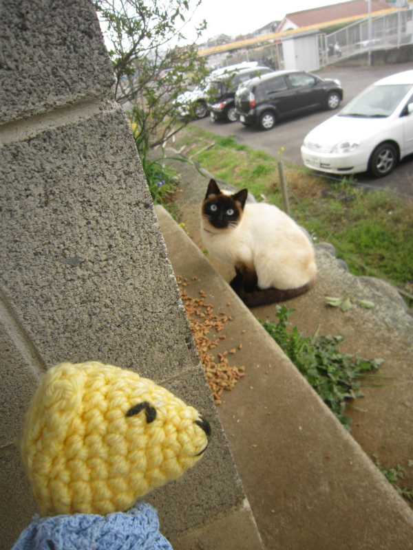 土手の水神さんの裏手でなにやら動物の気配。おや、こんなところにシャム猫が。