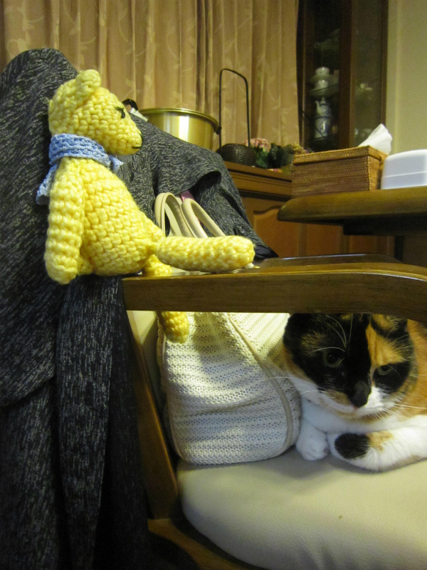 すっかりお気に入りになった場所は食卓の椅子の上。食事中もおりこうに座ってました。