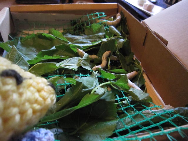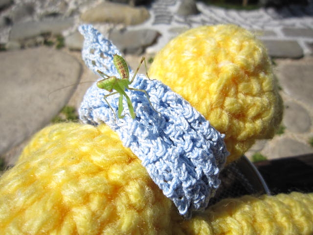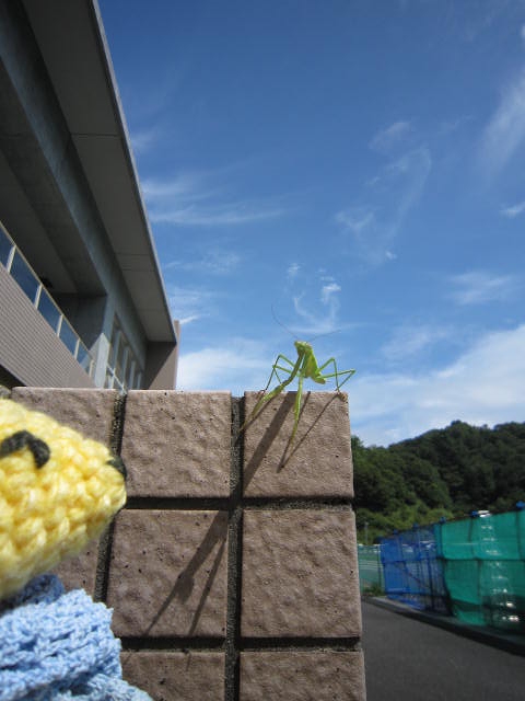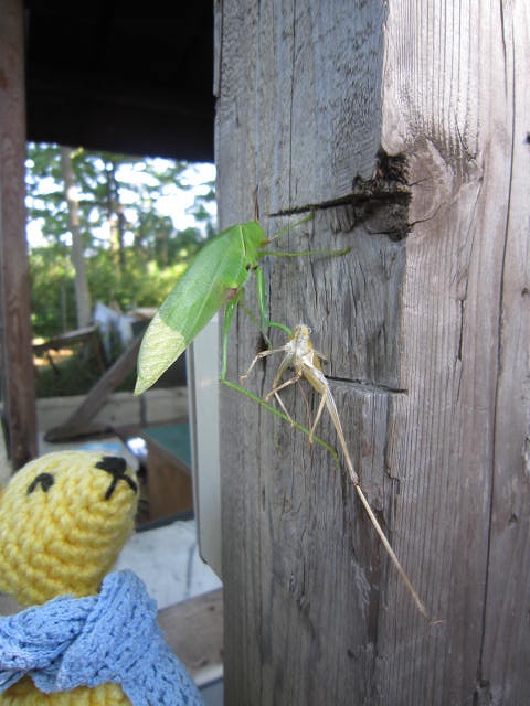 クツワムシだろうか。緑の虫が逃げずにいると思ったら脱皮の最中だった。