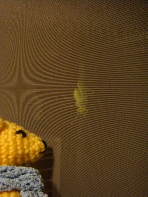 スイッチョンスイッチョンとやたら大きく聞こえると思ったら、網戸で虫が鳴いていた。