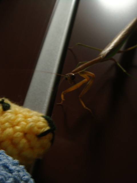 帰ったら玄関のドアと保護色のカマキリが!