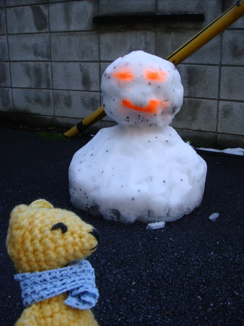先日の雪でこんな雪だるまが作ってあった。顔は蛍光塗料なんだろうか。