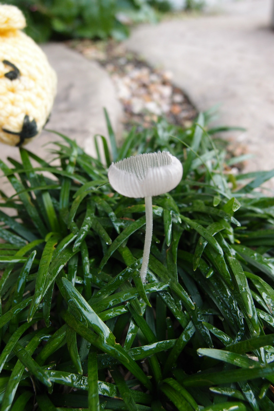 朝、物干し棹の足元にとっても繊細なキノコが。クラゲみたい。