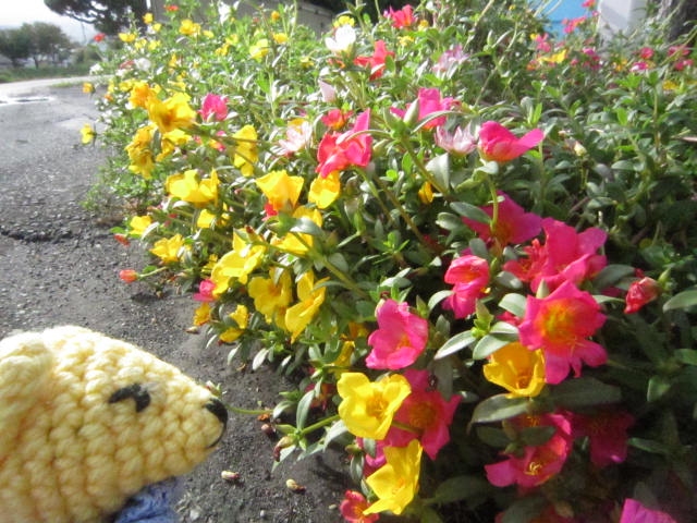 台風に耐えたポーチュラカの明るい花が足元にたくさん。