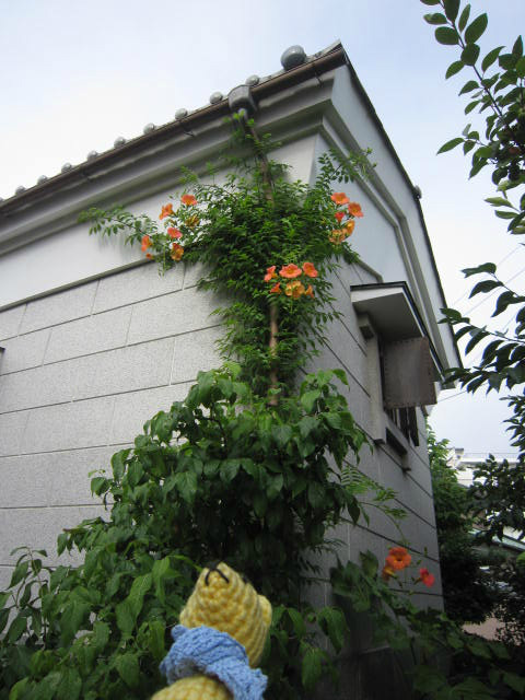高ーいところでノウゼンカズラが咲いている。
