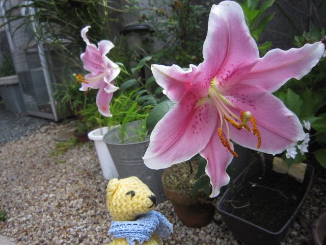 ペリカンのくちばしのようなユリのつぼみがクワっと口を開いて大笑い。