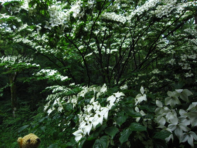 ふんわりと雪が積もっているかのような、真っ白いヤマボウシの花。