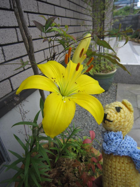 鉢植えの庭木の脇にいつの間にやら黄色いユリが。