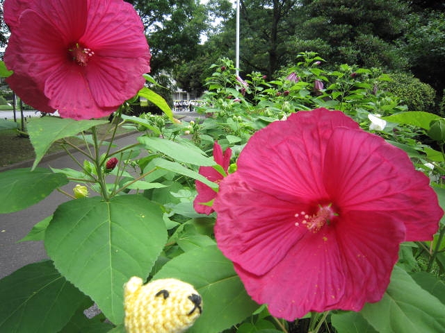 大きな芙蓉が咲いてるなーと思って近寄ったら、ちょっと背丈は低くて葉っぱの形も違うみたい。ハイビスカスにも似たその花の名は、アメリカフヨウとのことでした。アメリカか。やっぱ大柄なのねぇ。