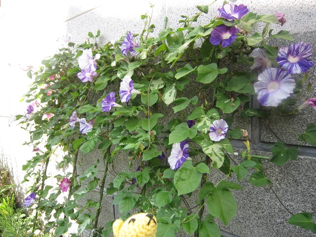早い時期にするすると勢いよく蔓が伸びて、棚の上のほうでラッシュ状態の今年の朝顔。