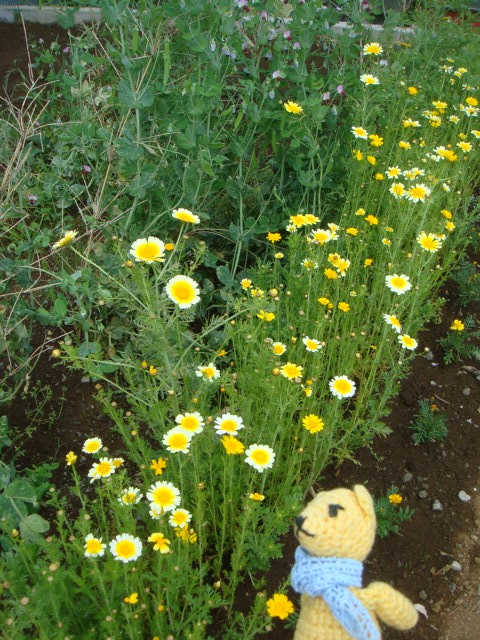 冬に収穫を逃れた春菊たちがきれいな花を咲かせている。まだまだ蕾もいっぱい。