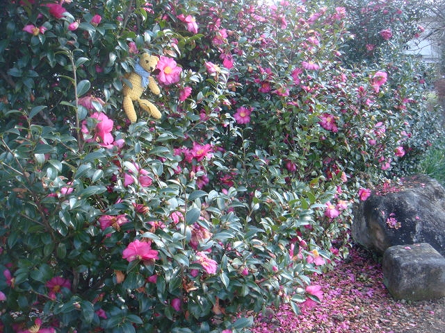 さざんかの木の下は花びらでピンク色。