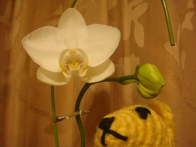 去年買った小さい鉢の胡蝶蘭。今年3つ蕾をつけそのうちのひとつが開花。
