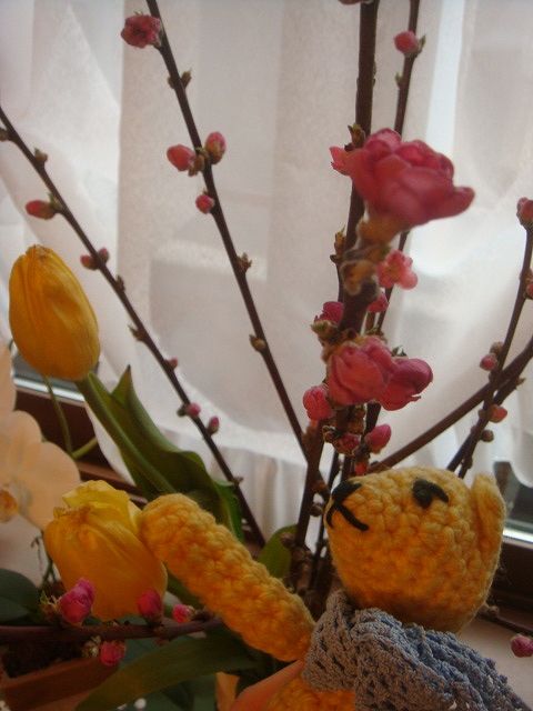 春節の宴のときにいただいたチューリップと桃が、あたたかい部屋のなかで咲いている。外はどんよりとして小雪もちらつくけど、この花たちの明るさで気持ちは晴れ晴れ。
