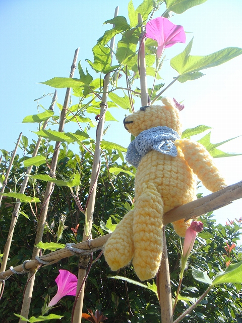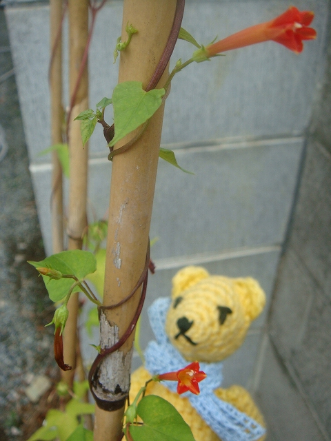 朝顔に似た葉っぱで一緒に育っていた朱色の小さな花。