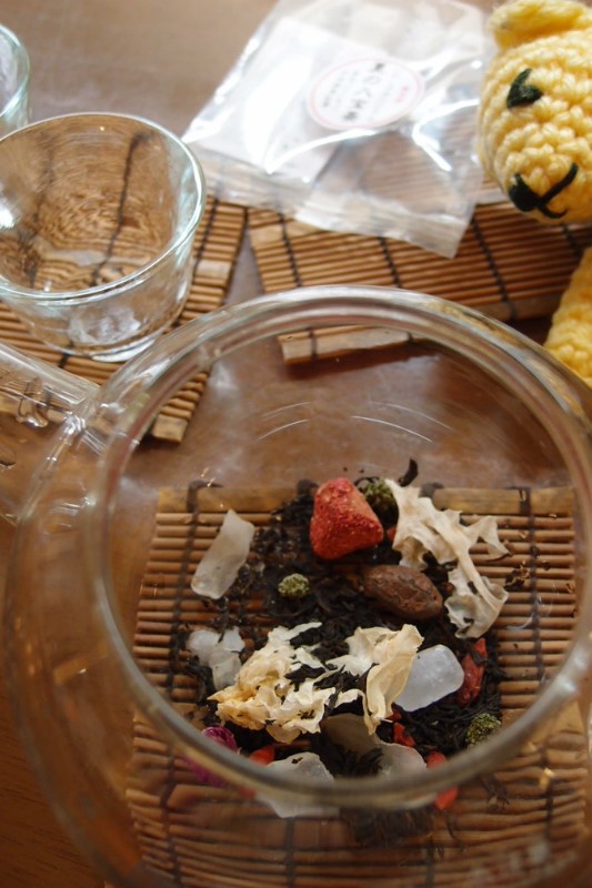 神奈川産の紅茶、クコの実、百合根、白キクラゲ、苺、千日紅、田七人参花、胖大海、氷砂糖。