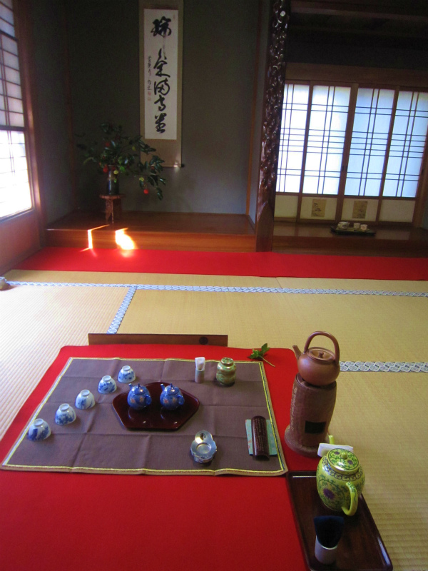 煎茶席は茶布敷点前。盛物は美男葛(実葛)。軸は瑞気満高堂