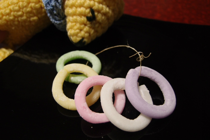 五色の環を麻縄で結わえたお干菓子。かわいい。