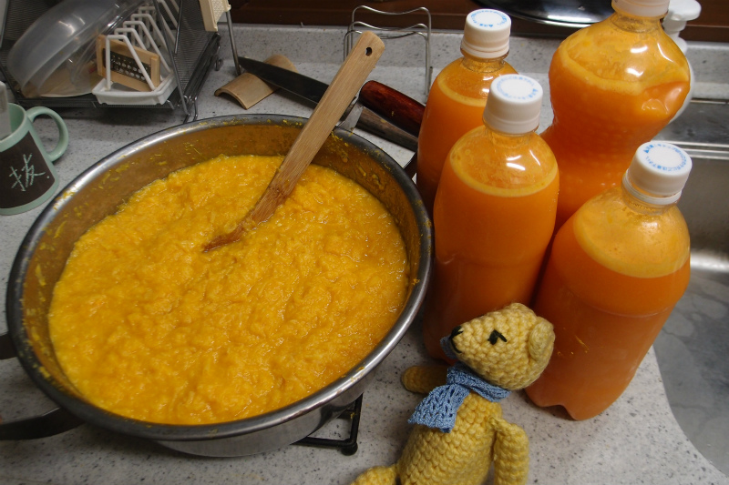 みかん処分にとりかかる。むいてむいて、ジューサーかけて、まずはジュース。