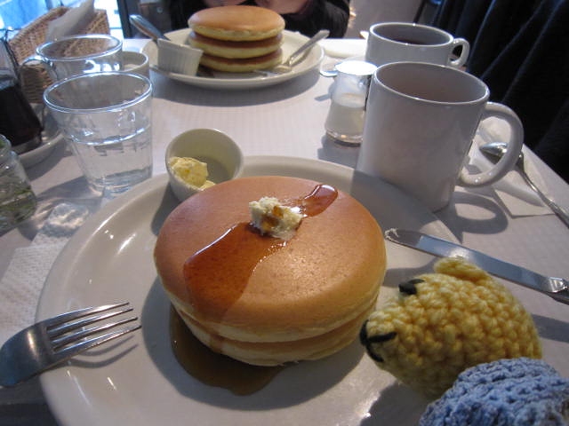 おやつの時間、パンケーキ専門店モトヤでお茶を。メイプルシロップとホイップバターで焼き立てのスイートプレーンパンケーキ。シンプルイズベスト!