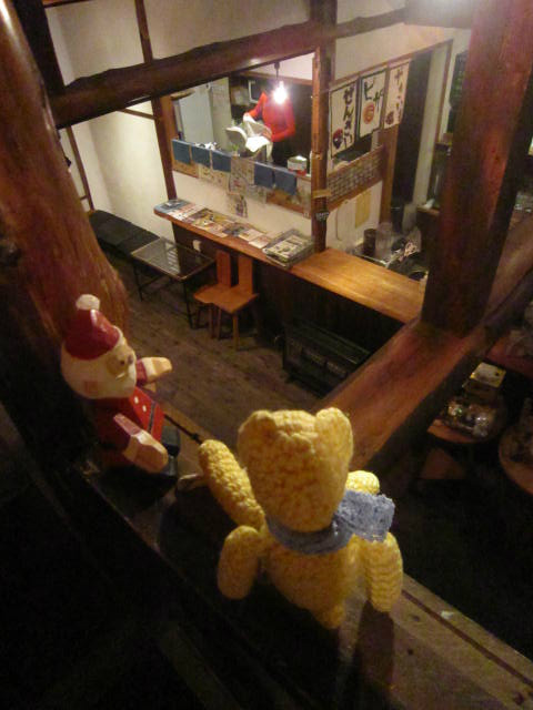 naraya cafeの梁の上サンタさんとばったり遭遇してすっかり話し込む。