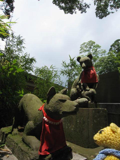 鳥居の両側にはお稲荷さま、しかも子守母狐とふたりを守る雄狐。