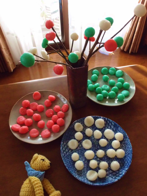 赤、緑、白。三色のどんど焼きのおだんご。