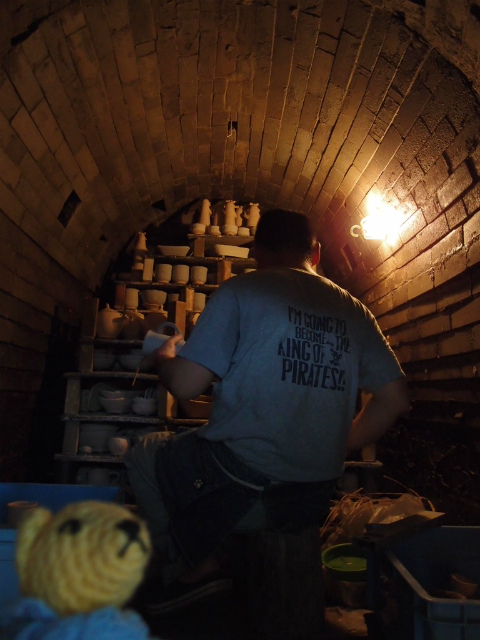 7月に1年半ぶりの火入れとのことで、ただいま登り窯に詰める作業中の時光窯へ。