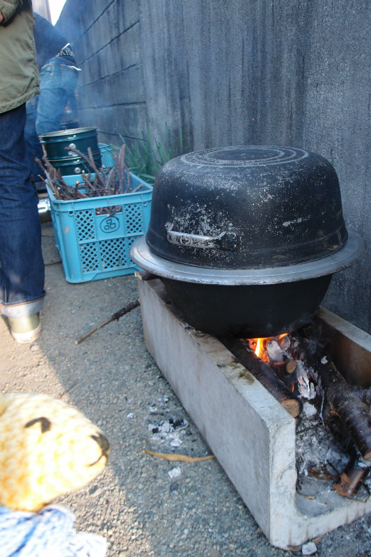 朝ごはんの会に参加させていただく。ロケットストーブで火をおこし、羽釜でご飯を炊き、