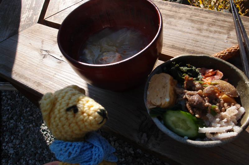 持ち寄ったご飯に合うおかずでみんなで朝ごはんを食べる。おいしい鶏団子汁付き!