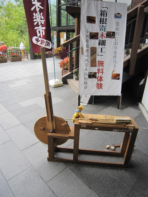 ふらりと湿生花園に立ち寄ったら入ったとたんに面白そうなものが。寄木細工のしおり作り無料体験。棒を下にぐいんと倒して滑車動かして、台の真ん中についているカンナで寄木細工の板をしゅっと削る。