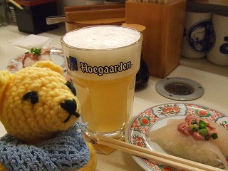 まずはヒューガルデンホワイトの生とカワハギ肝付きにぎり。旨っ!